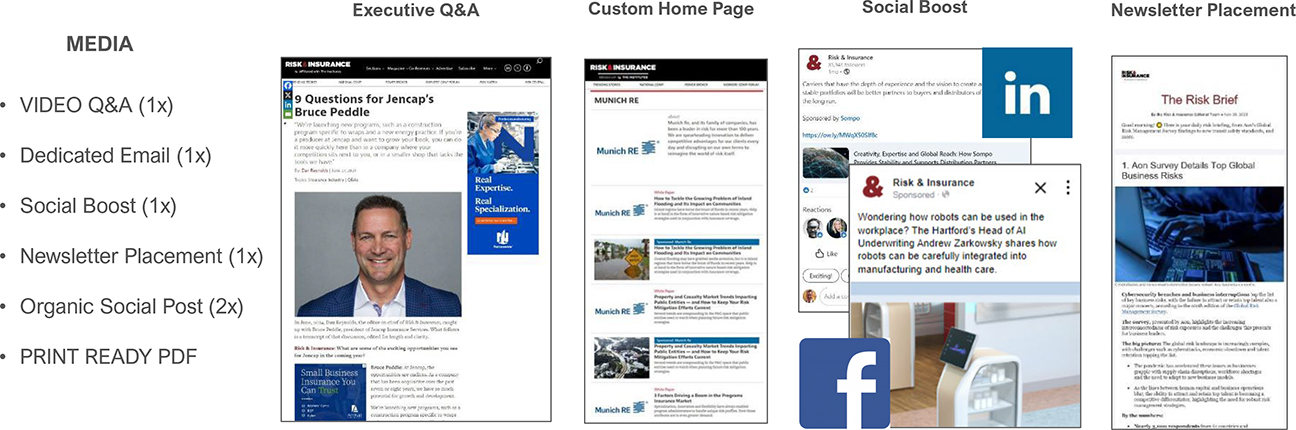 This custom package is designed to provide comprehensive visibility and engagement opportunities across Risk & Insurance’s digital platforms. It combines editorial content, advertising placements, and social media amplification to maximize brand exposure and audience reach.