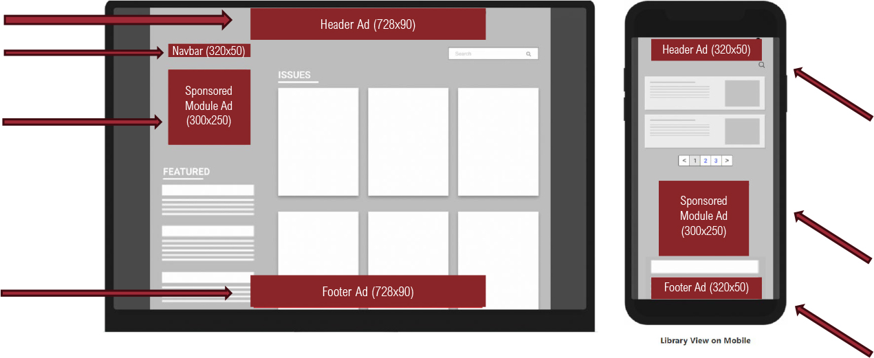 Below illustrations help explain all placements (Header, Navbar, Sponsored Module & Footer) for both desktop and mobile